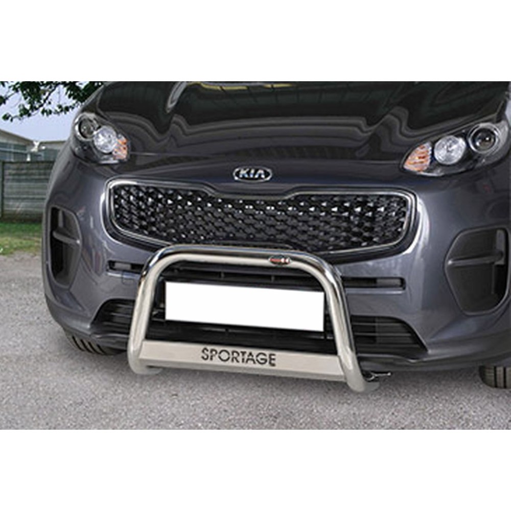 Compatibilita': Kia Sportage immatricolata dal 2016 al 2021. Bull Bar anteriore in acciaio inox lucido diametro 60mm con scritta modello auto (possibile averlo anche in versione Black-Edition). Fornito con kit di montaggio e certificato di omologazione europeo specifico (CE). ATTENZIONE: Non sempre compatibile con sensori di parcheggio e sistema anti-collisione.