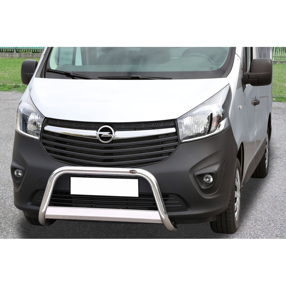 Compatibilita': Opel Vivaro immatricolata dal 2014 al 2018. Bull Bar anteriore in acciaio inox lucido, diametro 60mm. Note: con traversa. Omologazione Europea: SI