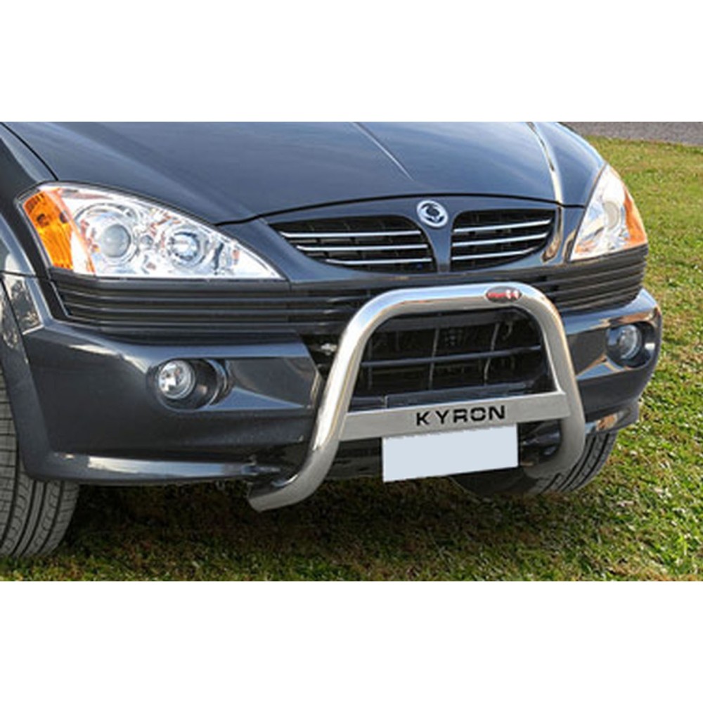 Compatibilita': SsangYong Kyron immatricolata fino al 2006. Bull Bar anteriore in acciaio inox lucido, diametro 60mm. Note: traversa con scritta modello auto