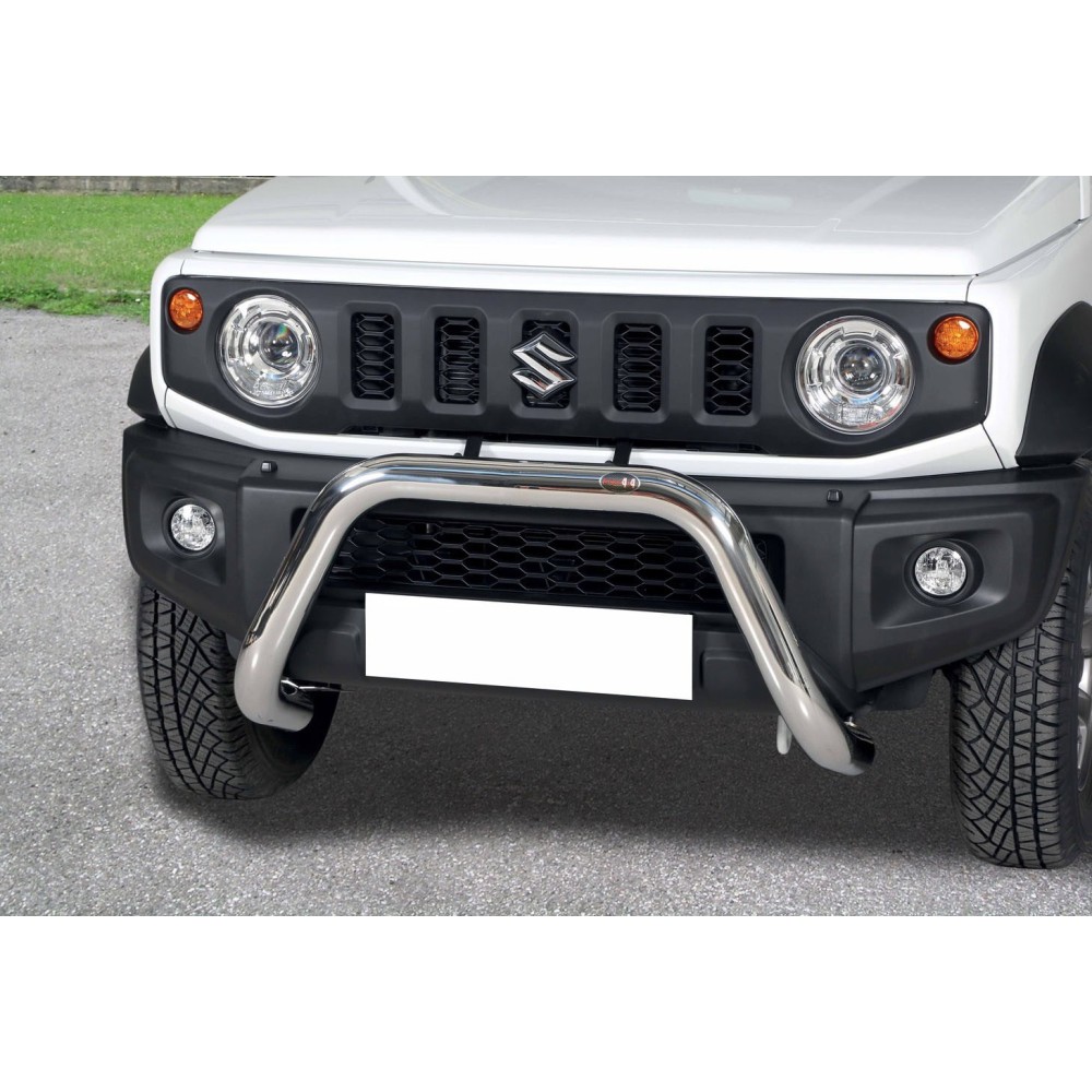 Compatibilita': Suzuki Jimny immatricolata dal 2018. Bull Bar anteriore in acciaio inox lucido diametro 70mm. Omologazione europea: SI. Fornito con kit di montaggio e certificato di omologazione europeo specifico (CE). ATTENZIONE: Non sempre compatibile con sensori di parcheggio e sistema anti-collisione.