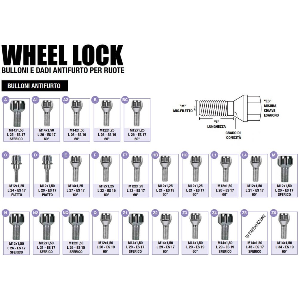 Kit 4 dadi antifurto ruote auto cerchi in lega M 14x1.50 22mm T21 60 gradi