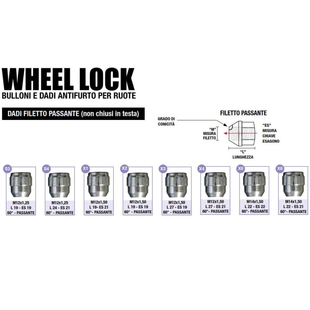 KIT 4 DADI ANTIFURTO CON FILETTO PASSANTE (NON CHIUSI IN TESTA) COMPLETO DI DOPPIA CHIAVE PER CERCHI ORIGINALI IN LEGA
