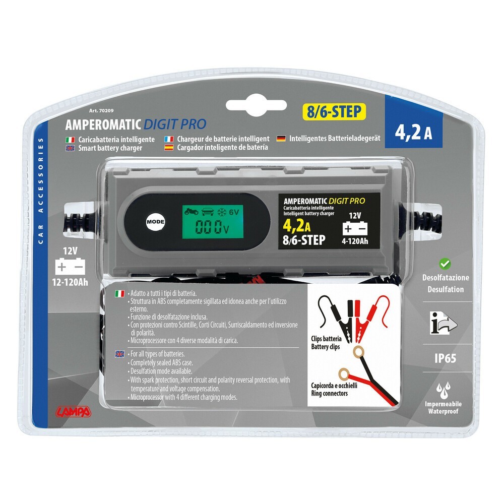 Struttura in ABS completamente sigillata ed idonea anche per l'utilizzo esterno (IP65). Con funzione di desolfatazione, che permette di ripristinare le funzionalità della batteria allungandone la vita utile ed eliminando la necessità della sostituzione anticipata. Con protezioni contro scintille, corto circuiti, surriscaldamento ed inversione di polarità. Microprocessore con 4 diverse modalità di carica. Clips per batteria e kit ad anelli per collegamento rapido. Adatto a tutti i tipi di batteria
