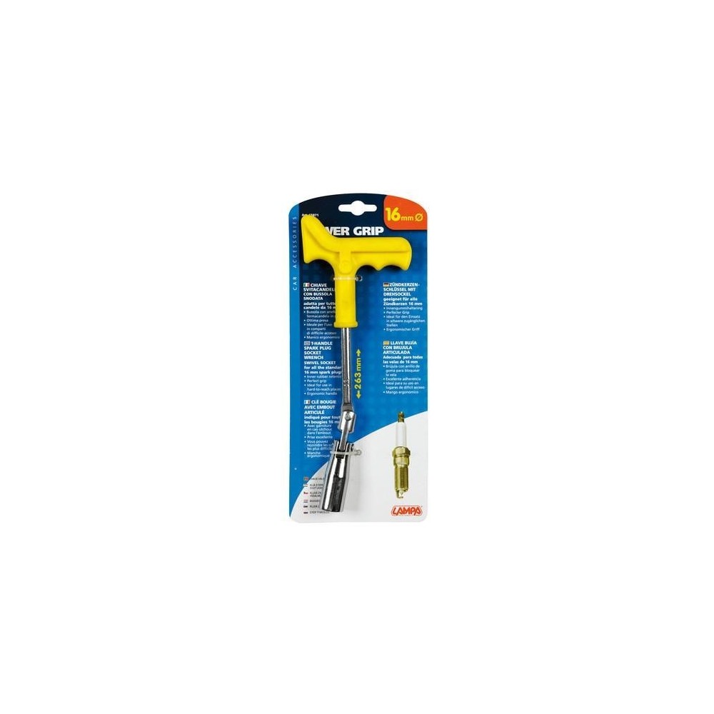 Power Grip, chiave svitacandele con bussola snodata da 16 mm. Bussola con anello fermacandela in gomma. Ottima presa. Ideale per l'uso in comparti di difficile accesso. Note: il colore del manico potrebbe essere differente da quello riportato in foto
