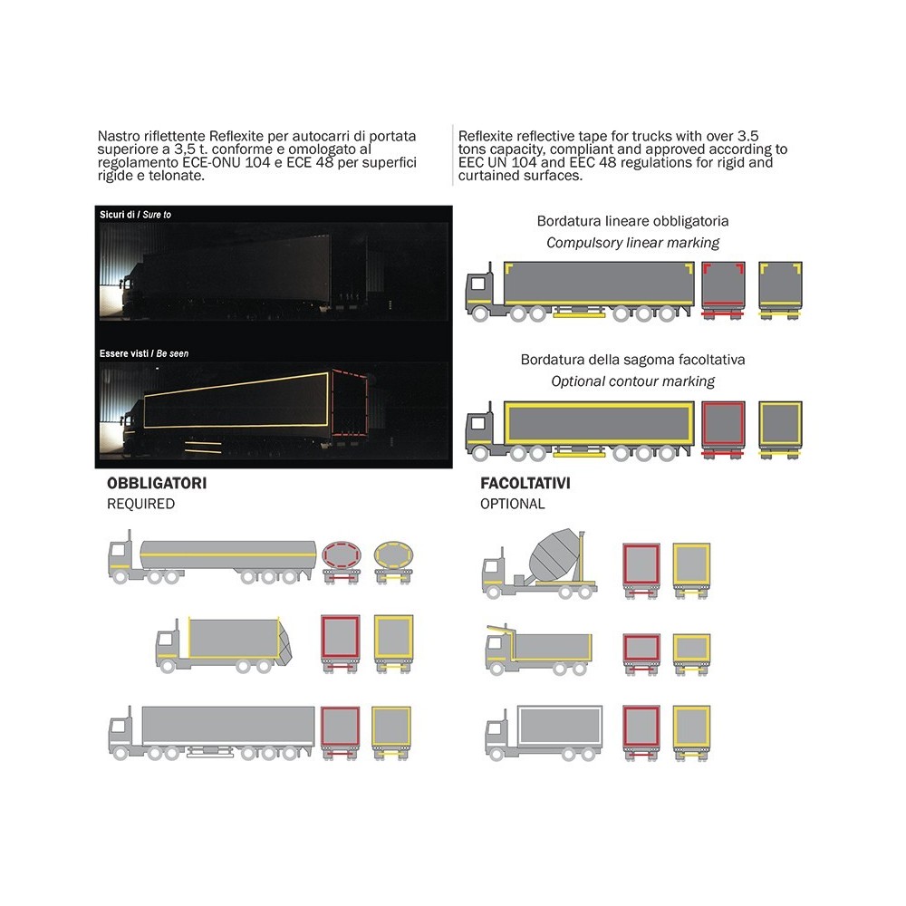 Nastro adesivo riflettente segmentato Bicma per autocarri di portata superiore a 3,5 t. conforme e omologato al regolamento ECE-ONU 104 e ECE 48 per superfici telonate. Lunghezza 50 metri, Larghezza 50mm