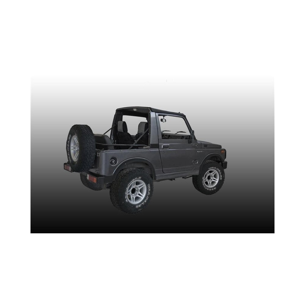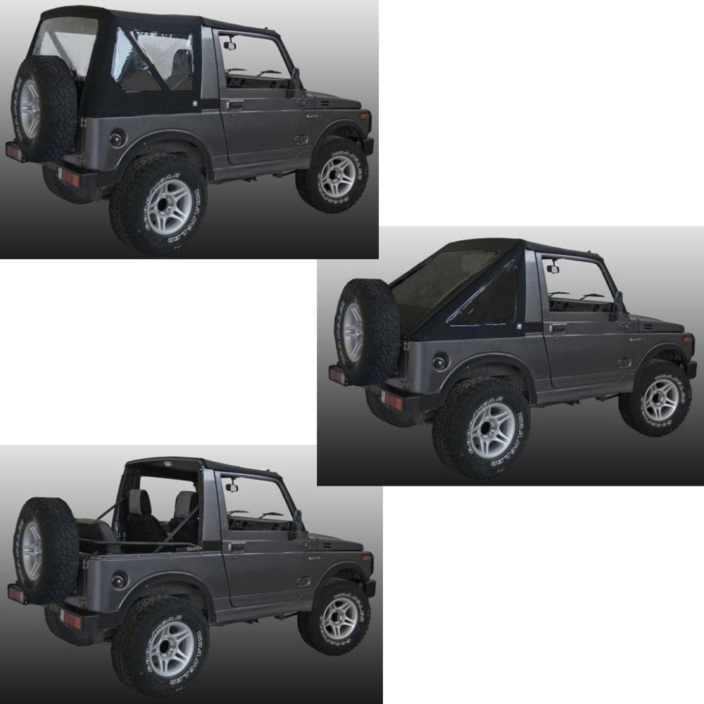 Soft 3top per Suzuki SJ/SAMURAI. 3 coperture soft in 1!, Standard,Fastback e Bikini!. Materiali ricercati, resistenti e funzionali, con finiture e fissaggi che rendono i teli perfettamente impermeabili e molto resistenti. Tessuto Denim spalmato impermeabile al 100% anticondensa, Tutte le finestre sono termosaldate per una perfetta tenuta all'acqua e durata nel tempo e il materiale utilizzato e' ad elevata trasparenza e flessibilita'. I teli sono disegnati, tagliati ed assemblati in base allo standard del produttore, per questo motivo si adattano perfettamente alla vettura valorizzando l'estetica. Fissaggio sull'hardware di serie e sulla canalina centrale fornita con i teli. Tre parti separate per un apertura indipendente. Nella versione piu' sportiva Fastback i vetri sono fume' mentre nella classica capote sono trasparente chiaro.