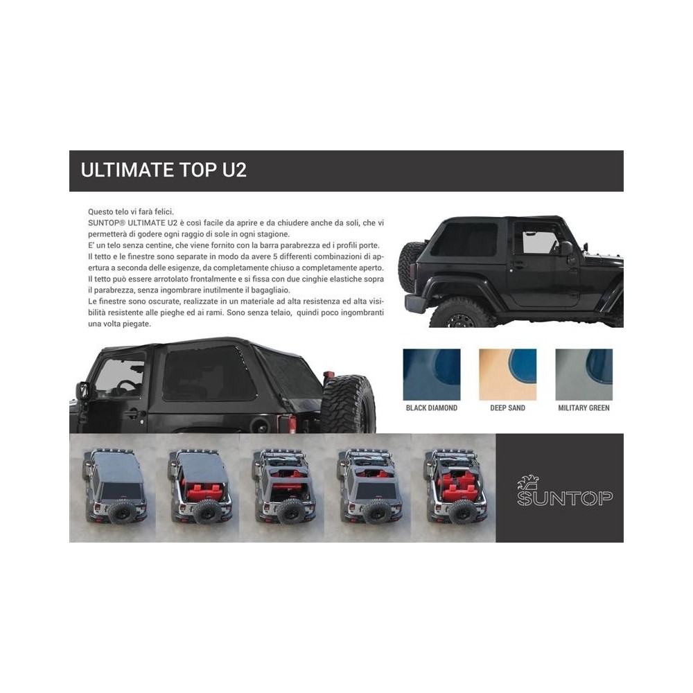 Si chiama Suntop Ultimate perchè e' la soluzione definitiva per il vostro Wrangler. Si puo' aprire con 4 conformazioni differenti per assicurarvi sempre il perfetto livello di copertura, o di scopertura...Senza centine e telaio, appoggia direttamente sul rollbar. Un nuovo tessuto denim completamente impermeabile garantisce la massima resistenza alle intemperie e la massima flessibilita', che unita alla resistenza ai maltrattamenti ed alle pieghe delle finestre Sun-Smoke in finitura scura, permette di piegarlo tutte le volte che volete occupando pochissimo spazio nel vostro bagagliaio. Da tutto chiuso a tutto aperto in meno di 1 minuto. Colore Denim nero con vetri fume'. Disponibile anche in colorazione Sabbia e Military green.
