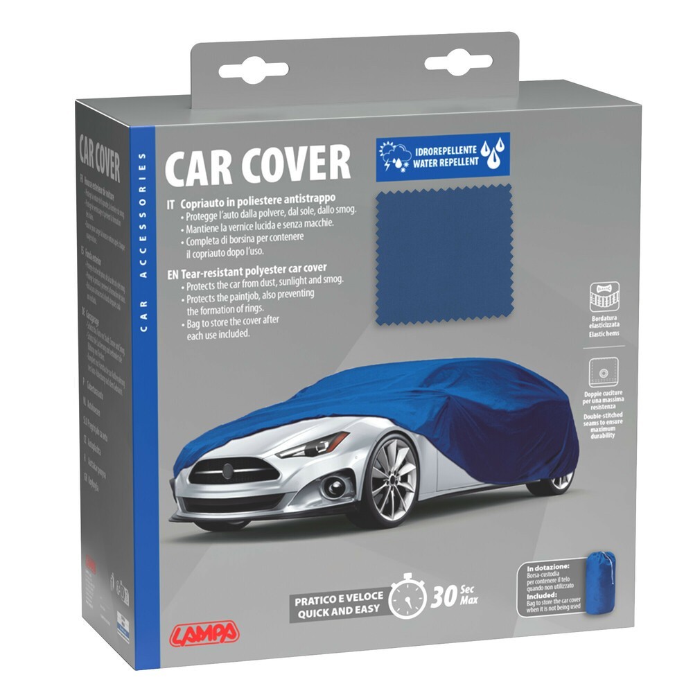 Copriauto idrorepellente, bordi elasticizzati sul davanti e sul retro. Con gancio antifurto. Installazione semplice e veloce, e' sufficiente una persona. Completo di borsa con cerniera e tracolla per contenere il copriauto dopo l'uso.