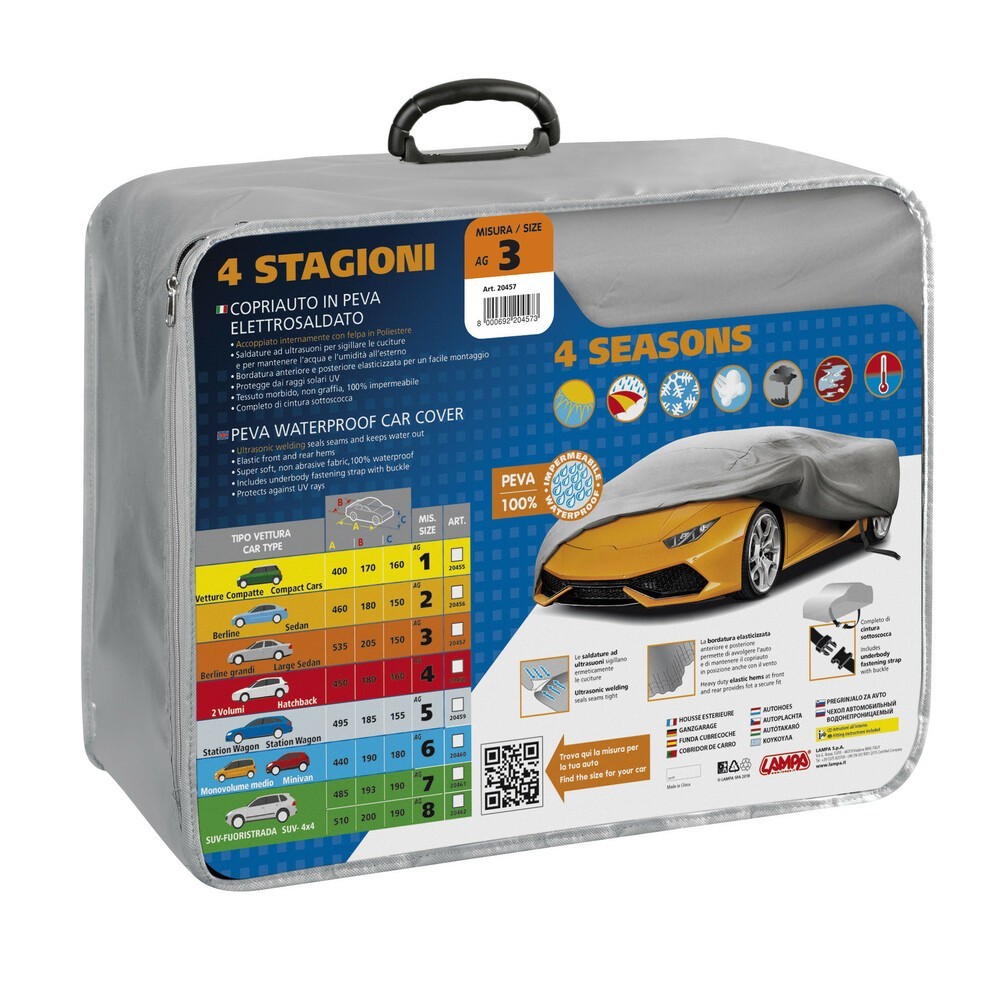 Copriauto in Peva elettrosaldato accoppiato internamente con felpa in poliestere, Saldature ad ultrasuoni per sigillare le cuciture e per mantenere l'acqua e l'umidita' all'esterno. Bordatura anteriore e posteriore elasticizzata per un facile montaggio. Tessuto morbido, non graffia, 100% impermeabile con protezione dai raggi solari UV. Completo di cintura sottoscocca. Misure: Lunghezza 535cm, Larghezza 205cm, Altezza 150cm
