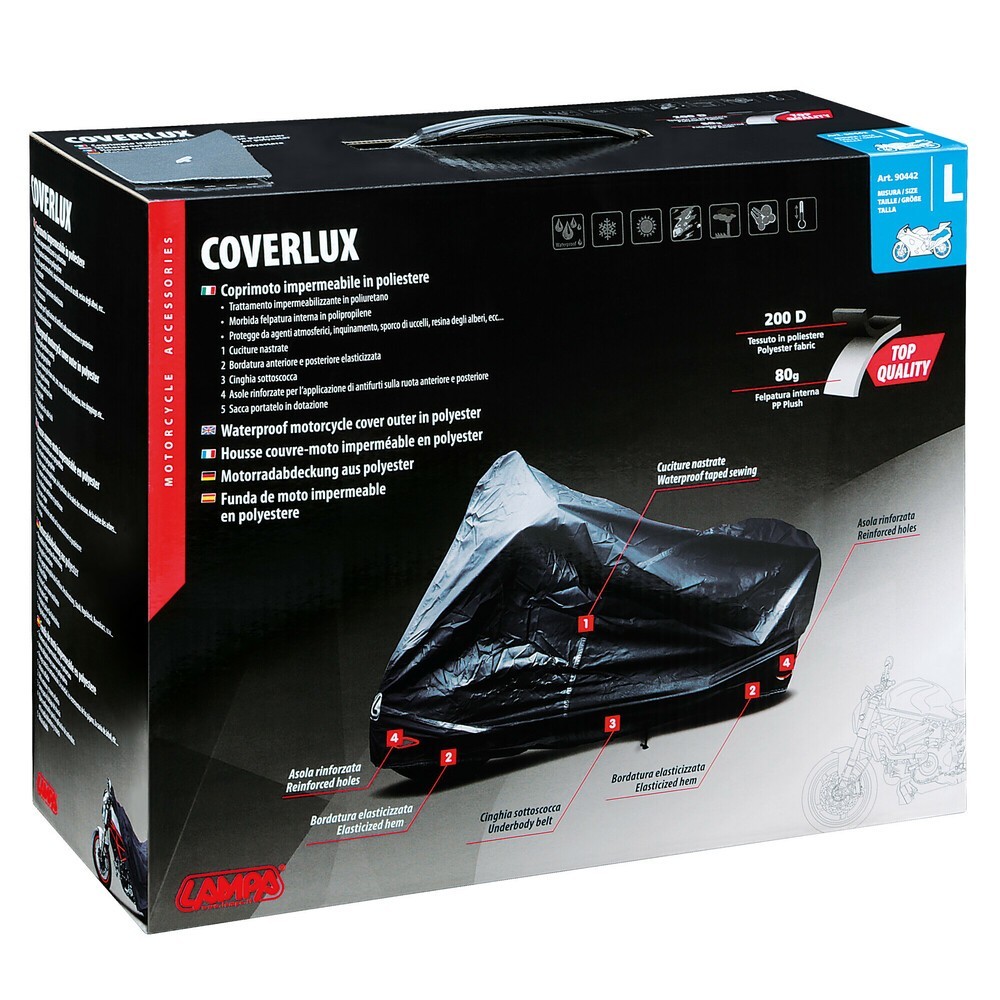 Coverlux, coprimoto, protegge da agenti atmosferici, inquinamento, sporco di uccelli, resina degli alberi...In tessuto poliestere 200D, Trattamento impermeabilizzante in poliuretano con cuciture nastrate, Morbida felpatura interna in polipropilene 80g. Resistente ai raggi UV. Bordatura anteriore e posteriore elasticizzata. Cinghia sotto scocca anti-vento. Asole rinforzate per l'applicazione di antifurti sulla ruota anteriore e posteriore. Sacca portatelo in dotazione. Disponibile in taglia S (183x119x89cm) -M (203x119x89cm) -L (229x125x99cm) -XL (246x127x104cm)