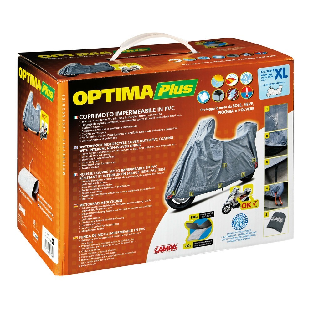 Optima Plus, coprimoto taglia XL, con sagomatura per moto/scooter con parabrezza e bauletto. Esterno in resistente PVC (140g) e interno in morbido tessuto non tessuto (60g).Cuciture nastrate. Bordatura anteriore e posteriore elasticizzata. Cinghia sottoscocca. Asole rinforzate per l?applicazione di antifurti sulla ruota anteriore e posteriore. Sacca portatelo in dotazione. Dimensione: 246x104x148cm (LHW)