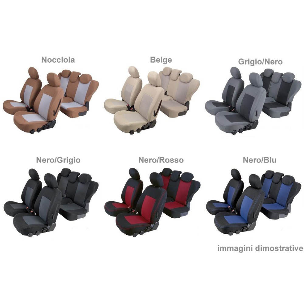 Lavorazione artigianale con tecnologia Cad/Cam e con cura nei minimi particolari per un montaggio ''Perfect-Fit''. Seguono scrupolosamente la sagoma dei sedili originali e li coprono completamente come un rivestimento. Quando installate sono un corpo unico con i sedili originali. Doppie cuciture a vista. Tessuto tecnico in poliestere certificato. Altissima resistenza alla rottura, abrasione, sfregamento, peeling, scolorimento, lavaggio. Non scolorisce al sole e nei ripetuti lavaggi. Imbottitura di supporto in spessa spugna antipiega da 8 mm accoppiata con maglina. Fianchi e retro elasticizzati, con spugna da 4 mm accoppiata a maglina. Taglio e cuciture simili al sedile originale. Con tasche di serie. Completo di aperture per poggiatesta, airbag e copripoggiatesta, copribraccioli, ecc. in conformita' alle caratteristiche dell?auto. Prodotto in Europa utilizzando tessuti italiani. Compatibilita': Fiat Grande Punto 5 porte dal 09/2005 al 04/2012 e Punto Evo 5 porte dal 2009. Composizioni disponibili: A) Schienale e sedile posteriore in un pezzo unico (1/1) con cintura di sicurezza centrale posteriore incorporata nello schienale. B) Sedile e schienale posteriori ripiegabili (1/3 + 2/3) con cintura di sicurezza centrale posteriore incorporata nello schienale. 4 poggiatesta. Colori disponibili: Beige, Grigio-Nero, Nero-Blu, Nero-Rosso, Nero-Grigio. N.B. In fase di ordine comunicare il colore e la composizione scelta