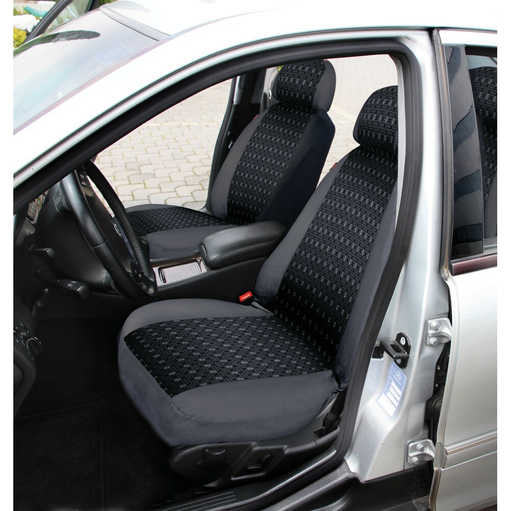 Kit completo coprisedili auto. Il kit comprende: 2 coprisedili anteriori + 2 coprisedili posteriori (con 3+3 cerniere) + 5 copri poggiatesta. Colore ANTRACITE