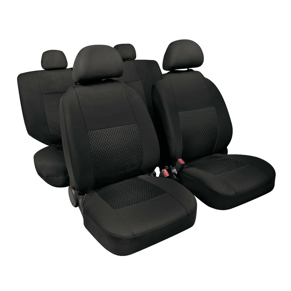 Linear - Set fodere coordinate in jacquard. 2 anteriori, 2 posteriori (con 2 cerniere), 4 copripoggiatesta. Tessuto in poliestere e imbottiture in spugna. Universali per la maggior parte delle vetture con sedili standard. Attenzione: non indicate per sedili con airbag. Colore: Nero