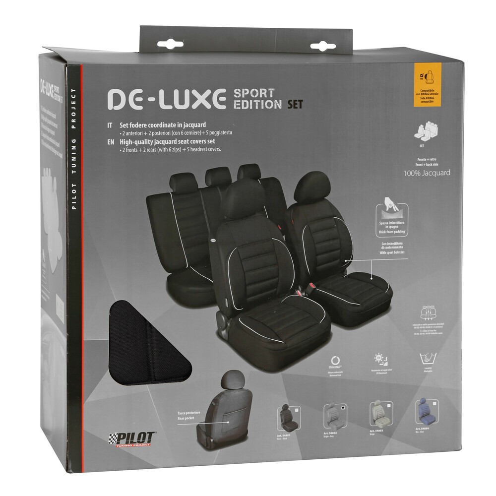 Qualita' superiore con seduta e schienale super-imbottiti e trapuntati. Rivestimento anteriore e tessuto elasticizzato in jacquard 100% coordinato. Sedili anteriori con imbottiture di contenimento sportive. Completo di 5 copri poggiatesta. Sedile e schienale posteriore con 6 cerniere, adatto anche per vetture con sedili separabili, ribaltabili. Universali per la maggior parte delle vetture con sedili standard, con e senza airbag. Compatibili con sedili forniti di airbag laterali. Colori resistenti alla luce. Imbottitura morbida. Copri poggiatesta inclusi. Schienale e sedile posteriore divisibili 50/50, 60/40, 40/60 (3+3 cerniere)