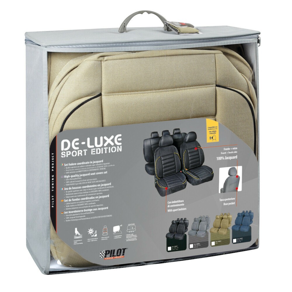 Qualita' superiore con seduta e schienale super-imbottiti e trapuntati. Rivestimento anteriore e tessuto elasticizzato in jacquard 100% coordinato. Sedili anteriori con imbottiture di contenimento sportive. Completo di 5 copri poggiatesta. Sedile e schienale posteriore con 6 cerniere, adatto anche per vetture con sedili separabili, ribaltabili. Universali per la maggior parte delle vetture con sedili standard, con e senza airbag. Compatibili con sedili forniti di airbag laterali. Colori resistenti alla luce. Imbottitura morbida. Copri poggiatesta inclusi. Schienale e sedile posteriore divisibili 50/50, 60/40, 40/60 (3+3 cerniere)