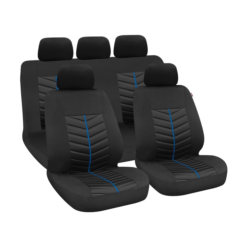 Set fodere composto da 2 anteriori, 2 posteriori (con 3+3 cerniere), 5 copripoggiatesta. Tessuto in poliestere e imbottiture in spugna. Universali per la maggior parte dei sedili standard. Compatibili con sedili forniti di airbag laterali. Colori resistenti alla luce. Imbottitura morbida. Copri poggiatesta inclusi. Sedili anteriori con apertura a velcro. Schienale e sedile posteriore divisibili 50/50, 60/40, 40/60 (3+3 cerniere). Parte centrale removibile per una maggiore adattabilita' ai sedili stretti