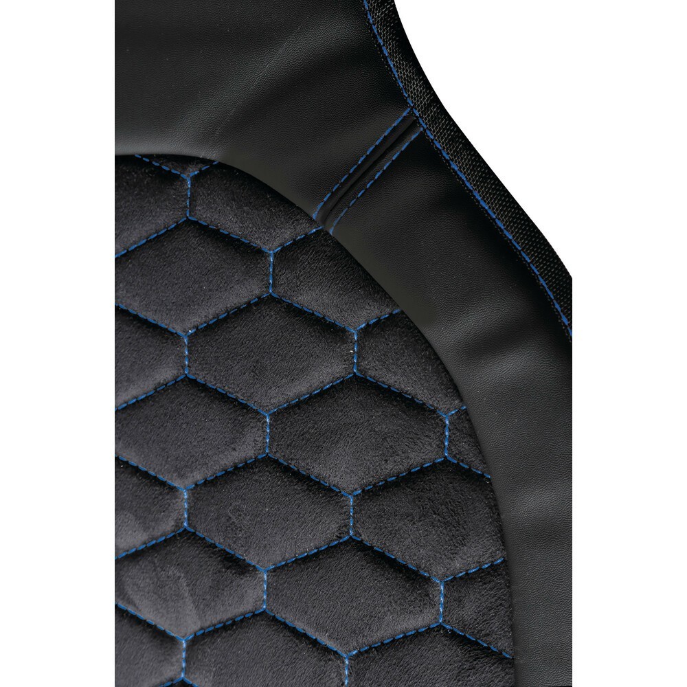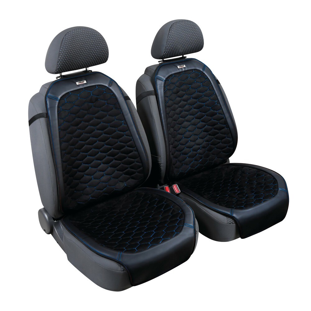 Coppia coprisedili anteriori in similpelle e tessuto microfibra scamosciato, con soffice imbottitura e trapuntatura a filo. Universali per veicoli con poggiatesta. Si installano in pochi minuti e si fissano al sedile utilizzando un innovativo sistema di aggancio al poggiatesta ed elastici. Non compromettono gli airbag dei sedili. Larghezza 50cm, Lunghezza parte superiore 64cm, Lunghezza parte inferiore 60cm.