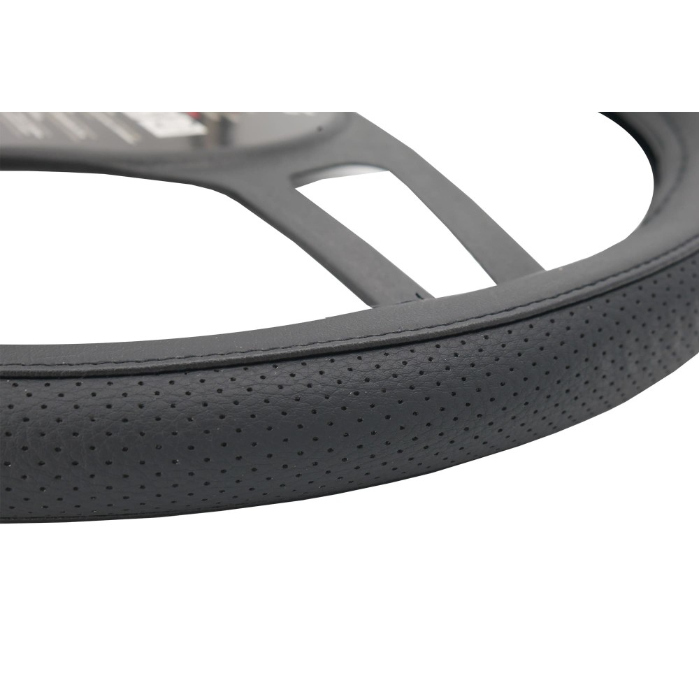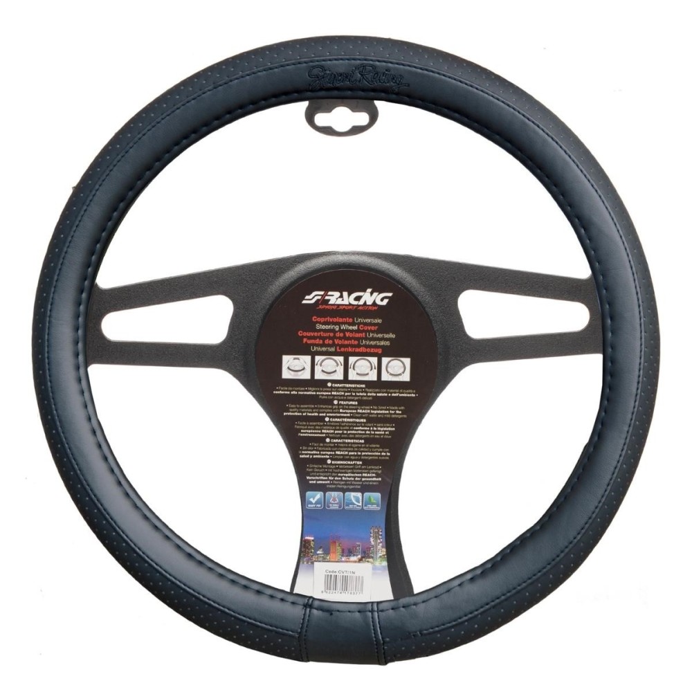 Modello Total Black Simoni Racing. Cod. CVT/16. Coprivolante universale per volanti con diametro compreso tra 37 e 39cm. In eco-pelle nera liscia e forata