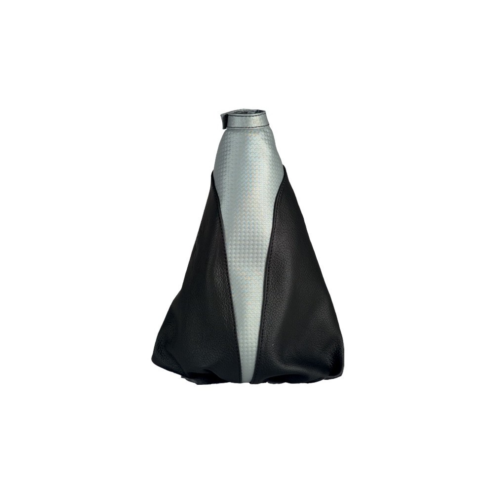 Cuffia cambio in pelle nera con inserto in pelle metal argento e supporto di fissaggio
