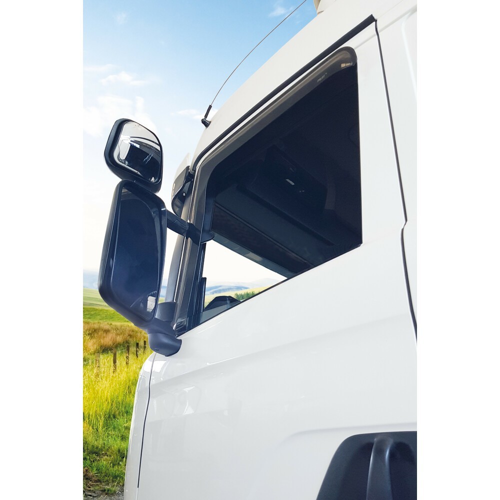 Set 2 deflettori in policarbonato ad iniezione. Montaggio esterno non-invasivo tramite adesivo speciale, senza viti, senza staffe di fissaggio e senza inserimento forzato tra la guarnizione del vetro e la carrozzeria. Lasciano entrare aria dall'esterno ed evitano che la pioggia e il pulviscolo entrino nell'abitacolo. Riducono la turbolenza ed il rumore dell'aria durante la guida con finestrini abbassati. Prodotti con materiale antiurto e antischeggia di ultima generazione in tonalita' fume' scuro, utilizzabili anche come deflettori parasole.