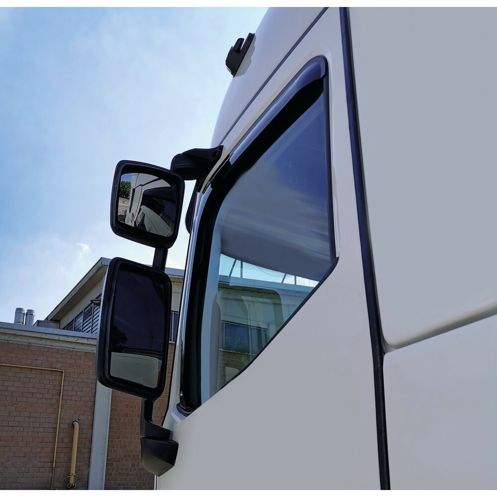 Compatibilita': Renault T dal 06/2013>. Set 2 deflettori in policarbonato ad iniezione. Montaggio esterno non-invasivo tramite adesivo speciale, senza viti, senza staffe di fissaggio e senza inserimento forzato tra la guarnizione del vetro e la carrozzeria. Lasciano entrare aria dall'esterno ed evitano che la pioggia e il pulviscolo entrino nell?abitacolo. Riducono la turbolenza ed il rumore dell'aria durante la guida con finestrini abbassati. Prodotti con materiale antiurto e antischeggia di ultima generazione in tonalita' fume' scuro, utilizzabili anche come deflettori parasole.
