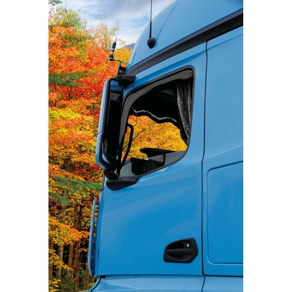 Compatibilita': Mercedes Actros MP4 (09/2011>09/2019) - Mercedes MP5 (10/2019>) - Mercedes MP5 F (11/2021>) - Mercedes MP5 L (11/2021>). Set 2 deflettori in policarbonato ad iniezione. Montaggio esterno non-invasivo tramite adesivo speciale, senza viti, senza staffe di fissaggio e senza inserimento forzato tra la guarnizione del vetro e la carrozzeria. Lasciano entrare aria dall'esterno ed evitano che la pioggia e il pulviscolo entrino nell'abitacolo. Riducono la turbolenza ed il rumore dell'aria durante la guida con finestrini abbassati. Prodotti con materiale antiurto e antischeggia di ultima generazione in tonalita' fume' scuro, utilizzabili anche come deflettori parasole.