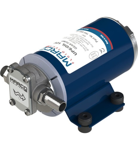 Elettropompa marca Marco modello UP6/OIL ad ingranaggi in bronzo appositamente studiata per travaso di oli lubrificanti o di liquidi viscosi. Modello professionale. Completa di due portagomma per tubo da diametro 14 mm interno e raccordo supplementare rapido per tubo da diametro 8 mm esterno. Adatta allo svuotamento dei carter dei motori. Corpo in ottone nichelato, alberino in acciaio inox. Caratteristiche: Alimentazione 12V, Adescamento 1,5m, Max press. 2bar, Portate: 25 l/h con tubo 6mm - 75 l/h con tubo 8mm - 480 l/h con tubo 16mm, Consumo 6,5-8,5A, Motore 120W, Fusibile 10A, Peso 2,5kg