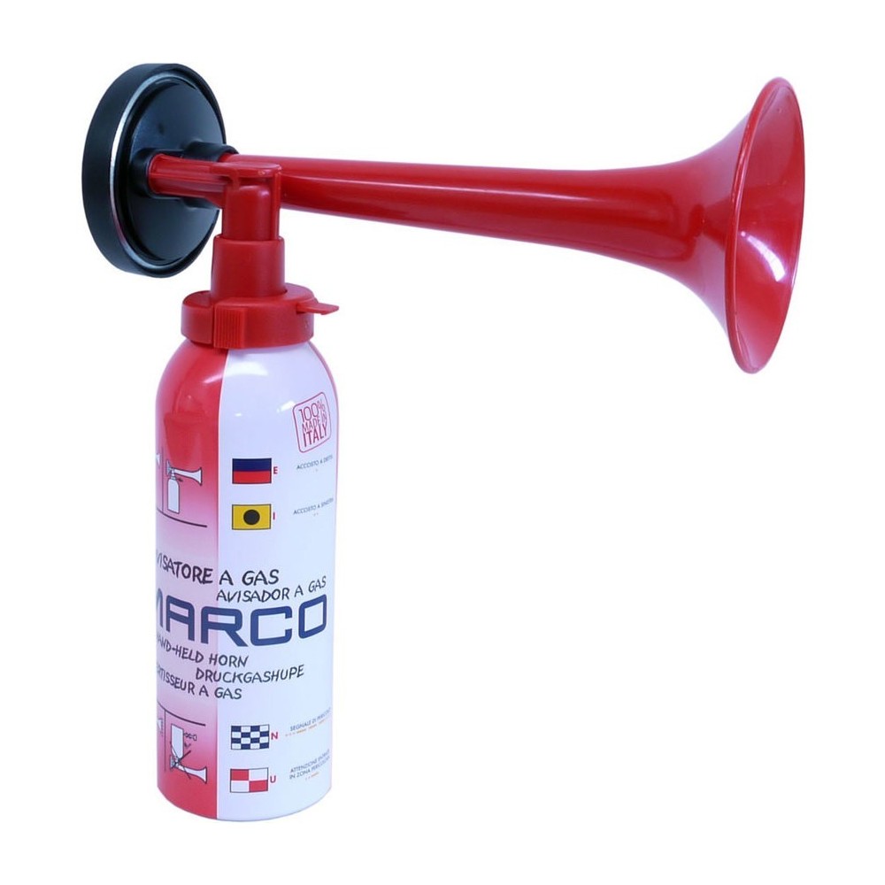 Tromba a gas marca Marco modello TA1 con attacco a scatto. Completa di bombola monoblocco in alluminio da 300 ml. Gas ecologico Infiammabile. Caratteristiche: 200ml, 116db, 400Hz, Lunghezza 190mm. Disponibile anche in versione con gas non infiammabile