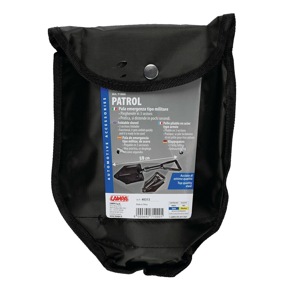 Pala d'emergenza tipo militare in acciaio, pieghevole in 3 sezioni, completa di custodia. Lunghezza 58cm