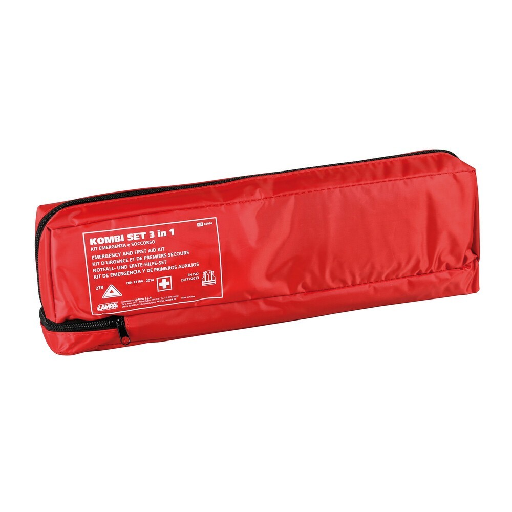 Kit emergenza e soccorso che contiene: Triangolo emergenza (Omologato E 27R), Veste riflettente (Omologato EN ISO 20471:2013), Kit pronto soccorso (1 Rotolo di cerotto 2,5 x 500cm + 14 cerotti misure assortite + 1 Rotolo di garza sterile 6 x 8cm + 2 Rotoli di garze sterili 8 x 10cm + 1 Rotolo di garza sterile 10 x 12cm + 1 Benda per ustioni 40 x 60cm + 1 Benda per ustioni 60 x 80cm + 2 Bende elastiche 6 x 400cm + 3 Bende elastiche 8 x 400cm + 1 Coperta isotermica oro/argento + 6 Compresse sterili 10 x 10cm + 2 Bende triangolari + 1 Paio di forbici taglia bendaggi + 4 Guanti usa e getta + 2 Salviette umidificate + 1 Manuale di primo soccorso)