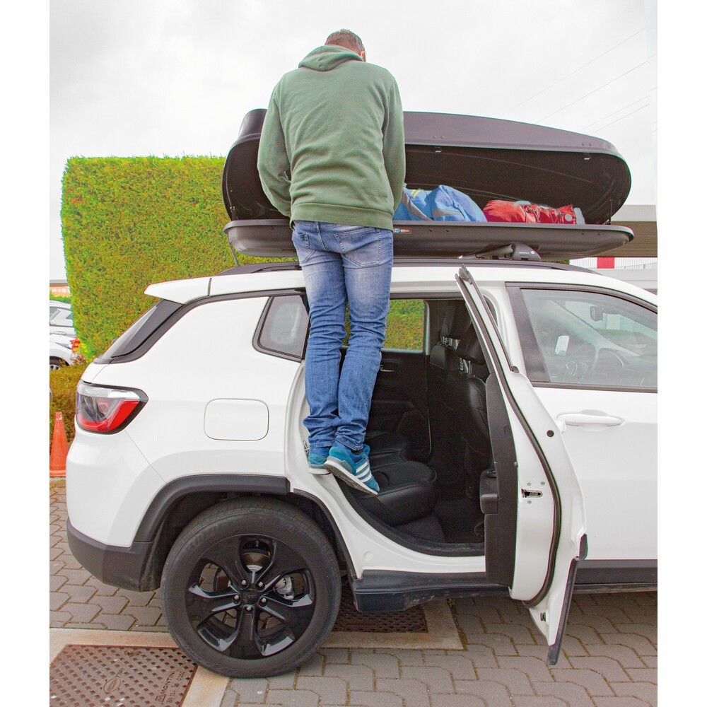 Facilita e permette le operazioni sul tetto della vettura senza l'ausilio della scala. Indispensabile quando si utilizzano box tetto, barre portatutto o quando si lava/asciuga l'auto (SUV, 4x4...). Aggancio sul blocco portiera. Realizzato in lega di alluminio con appoggio in gomma anti-graffio, dotato di punta frangivetro da utilizzarsi in caso di emergenza. Portata max. 200Kg