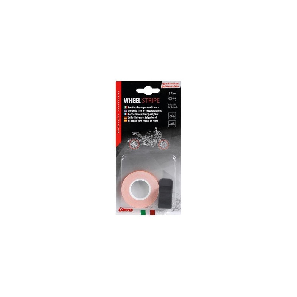 Kit profili per 2 cerchi moto o 4 cerchi auto. Universale, altezza 7 mm. Lunghezza 600 cm. Applicatore incluso. Tinte con colori pastello