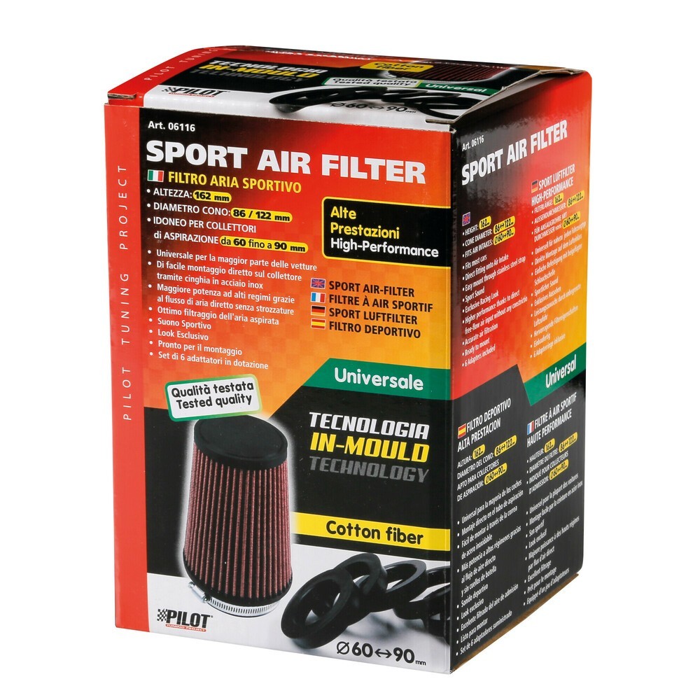 Filtro aria universale per la maggior parte delle vetture. Montaggio diretto sul collettore tramite fascetta in acciaio inox e set di adattatori. Suono sportivo e look esclusivo. Maggiore potenza ad alti regimi grazie al flusso d'aria diretto senza strozzature. Ottimo filtraggio dell'aria aspirata. 2 anni di garanzia. TECNOLOGIA IN-MOULD: Speciale resina in poliuretano, leggera, morbida e flessibile, stampata ed iniettata a caldo. La superficie filtrante viene ''sigillata'' all'interno della cornice in poliuretano e tutto il filtro diventa un corpo unico, senza incollaggi, saldature o fessure che potrebbero compromettere la durata e la performance del filtro. Altezza 162mm. Base diametro 122mm. Attacco diametro 60-90 mm con kit adattatori universali