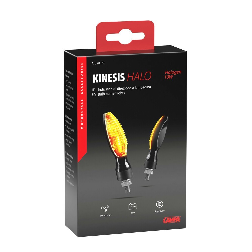 Indicatori di direzione con lampade alogene 10W, omologati E pressostampati, Lente bianca / luce arancio. Cavi con connettori rapidi, Sporgenza con snodo gommato antirottura, Alta resistenza alle vibrazioni. Disponibili nelle colorazioni nero e carbon look. Filettatura M8