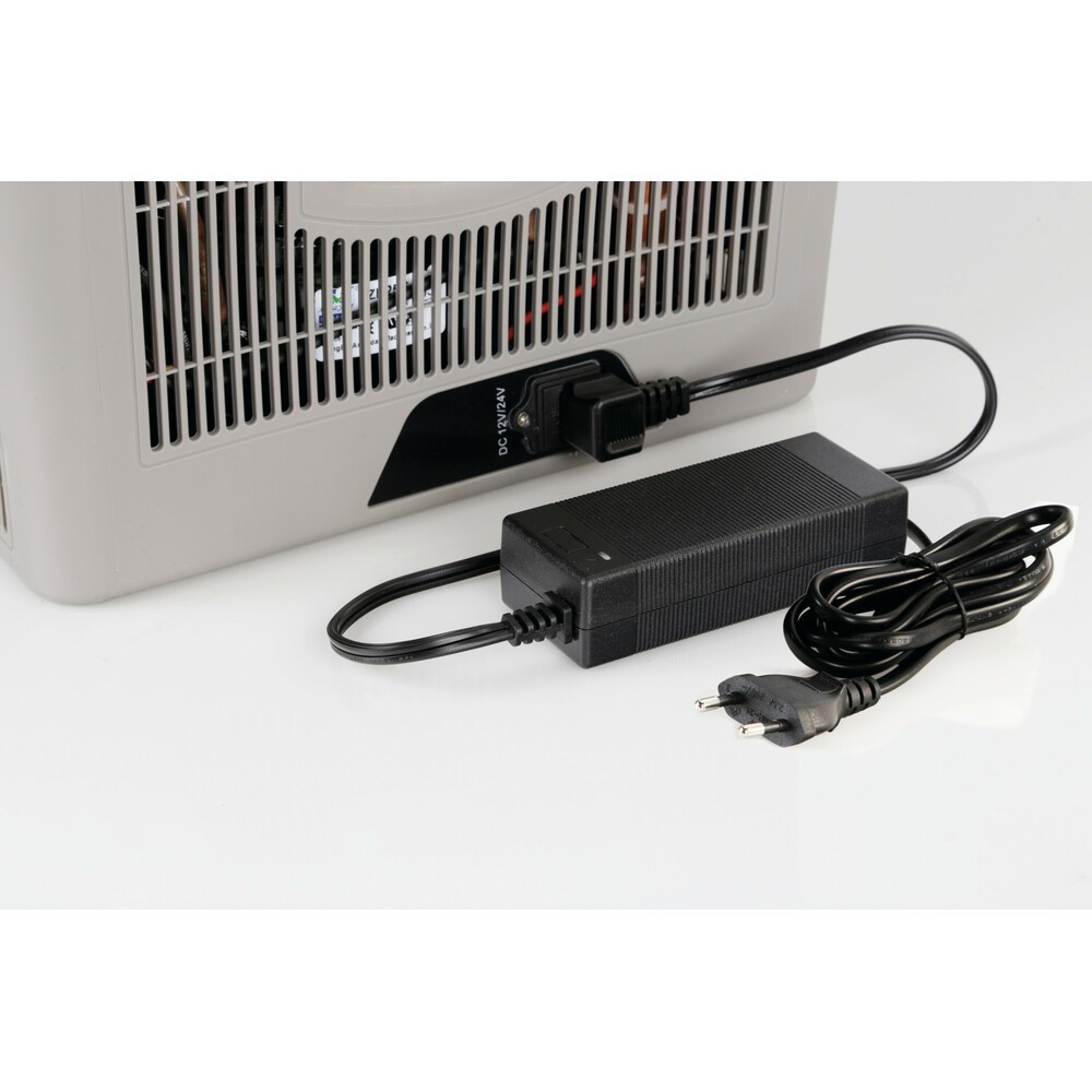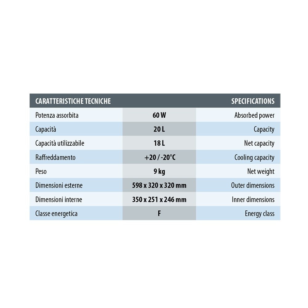Compressore ad alte prestazioni con gas tipo R600a (senza CFC) a bassissimo impatto ambientale. Display e termostato digitali. Alimentazione a CC 12/24V o CA 220~240V (utilizzando l'apposito adattatore). Massima capacità di raffreddamento: regolabile da +20 a -20°C. Con funzione salva-temperatura e sistema intelligente di protezione della batteria a 3 stadi. Assorbimento 60W. Rumorosità ≤ 45dB (abcD). Dimensioni Esterne 598x320x320mm. Classe energetica F