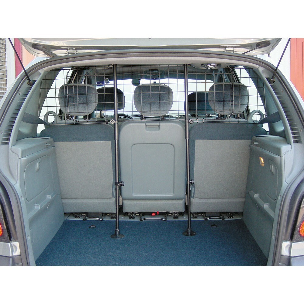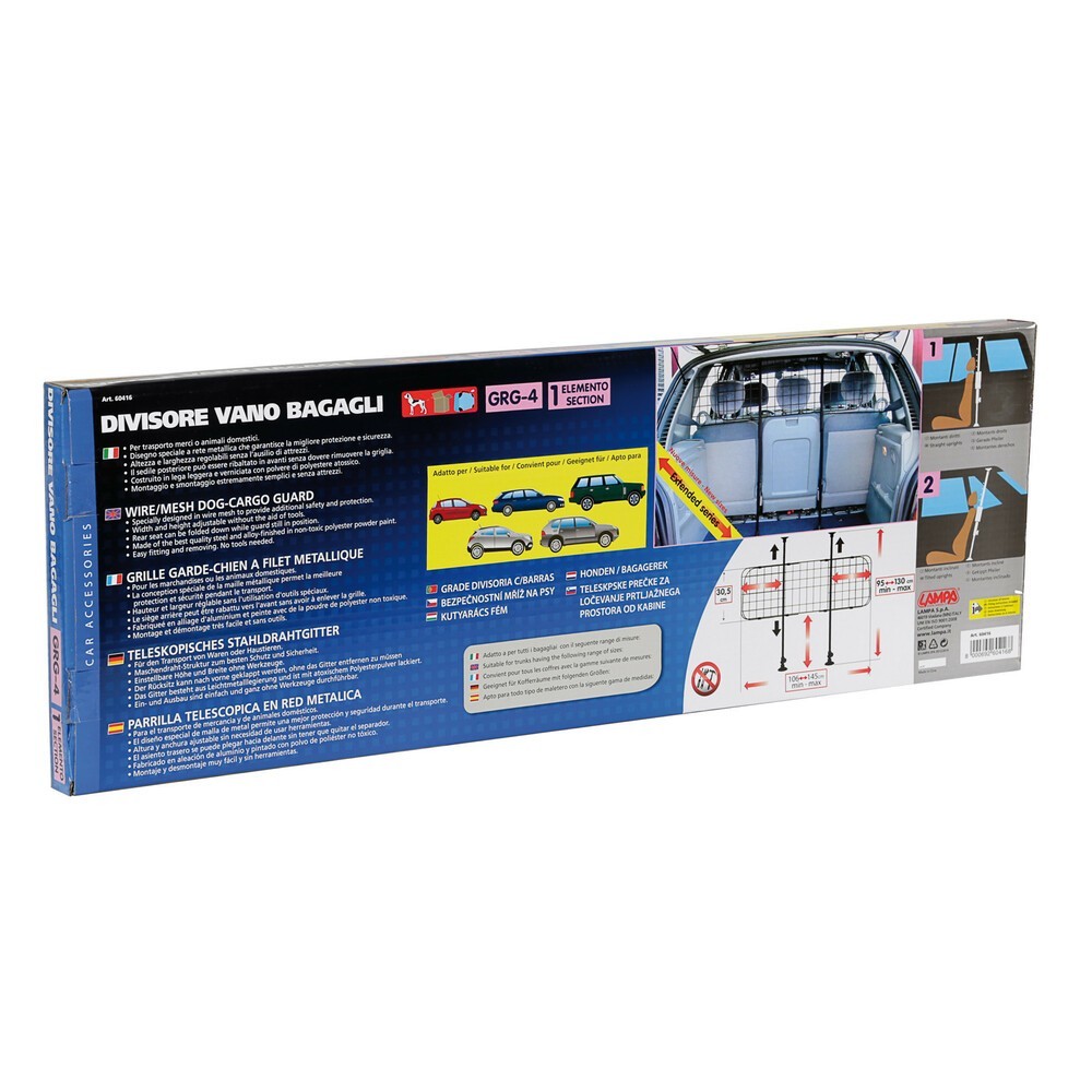 Dog cargo guard. Griglia divisoria in rete metallica, telescopica. Universale, adatta per il trasporto merce o per animali domestici. Altezza e larghezza regolabili. Il sedile posteriore puo' essere ribaltato in avanti senza rimuovere la griglia. Costruita in lega leggera e verniciata con polvere atossica. Montaggio e smontaggio semplici e senza attrezzi. Dimensioni: da 47 a 108cm di altezza, da 91 a 131 cm di larghezza.