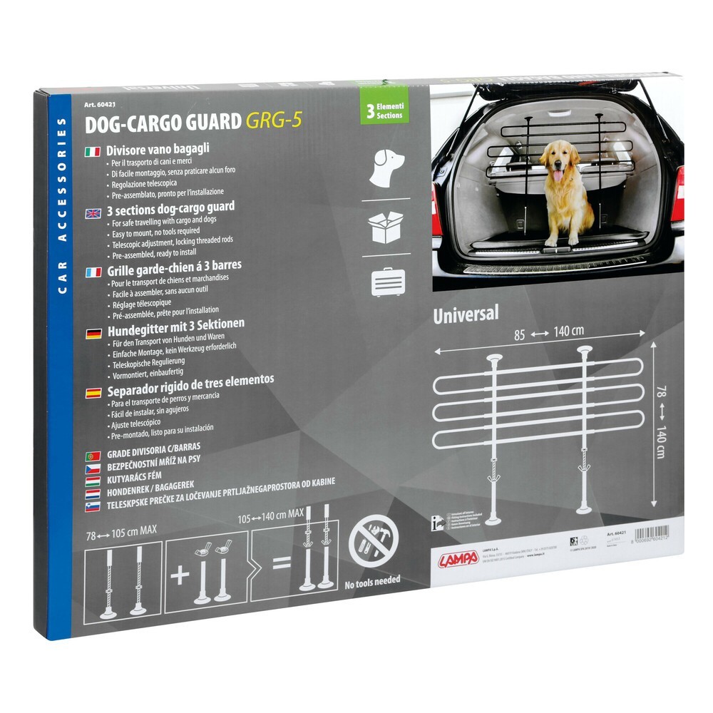 Separatore telescopico a 3 elementi per trasporto di cani e merci. Pre-montato, pronto per il montaggio. Bloccaggio con aste filettate. Di facile montaggio, senza praticare alcun foro. Fissaggio universale. Dimensioni: da 78 a 140cm di altezza, da 85 a 140 cm di larghezza.