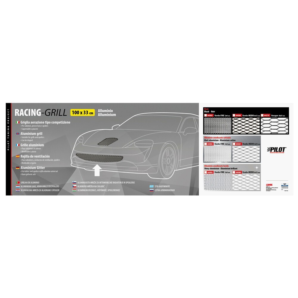 Griglia aerazione competizione, in lega di alluminio anodizzato, per radiatori, prese d'aria, spilers, ecc.. TRAMA: Rombo fine 2x4mm. Dimensioni: 100x33cm