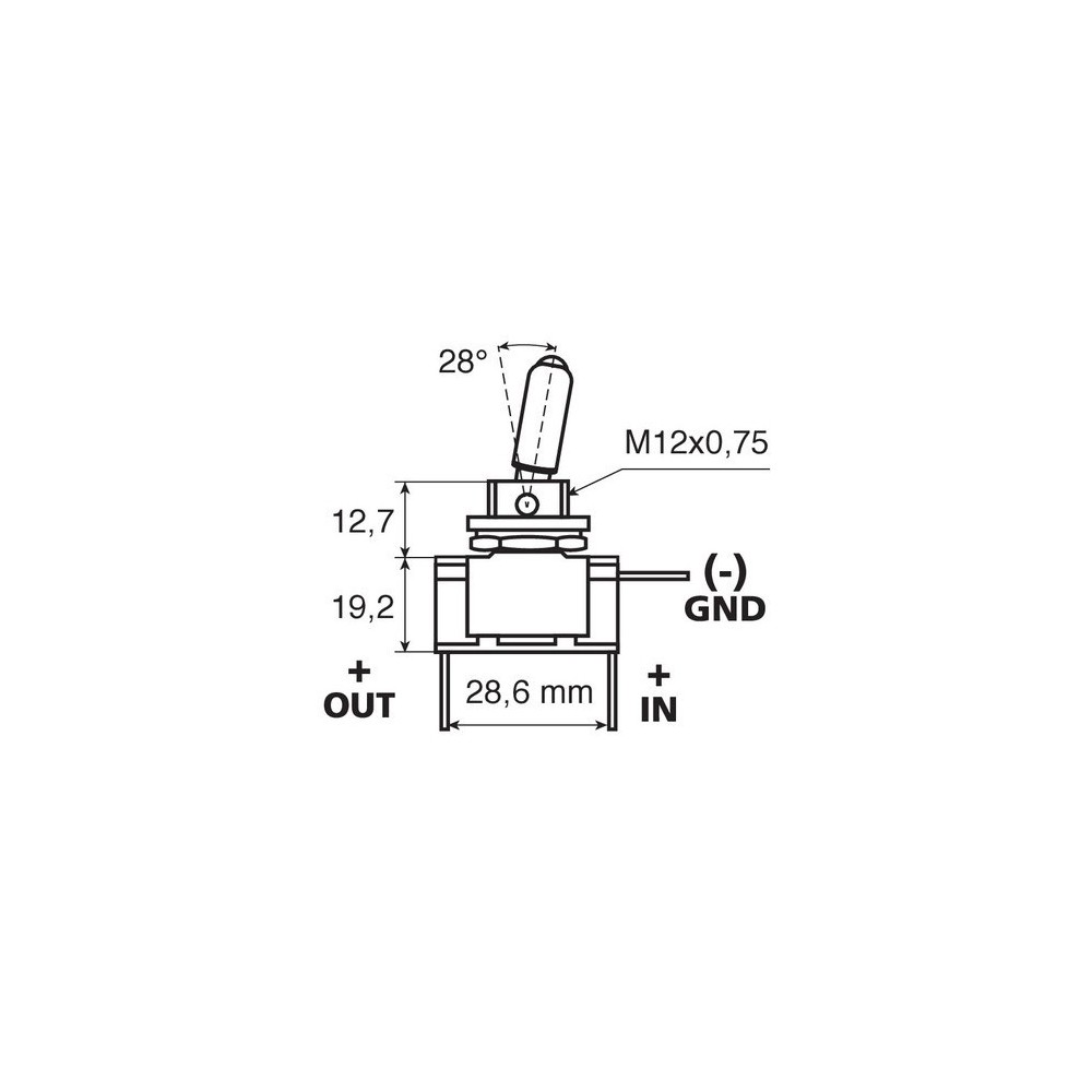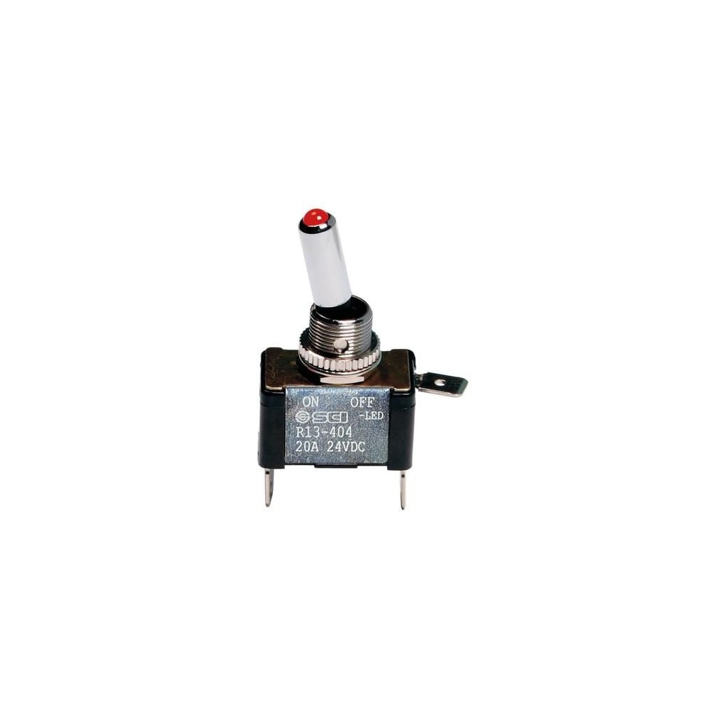 Interruttore a leva, 2 contatti. In alluminio, con spia a led ROSSA. Foro 12,2mm, spessore max 6mm. Alimentazione 12V, 20A.