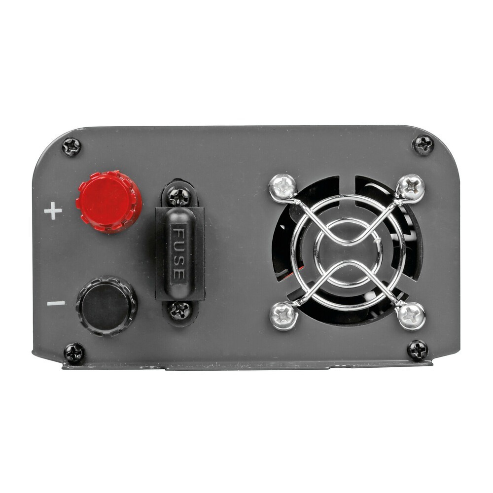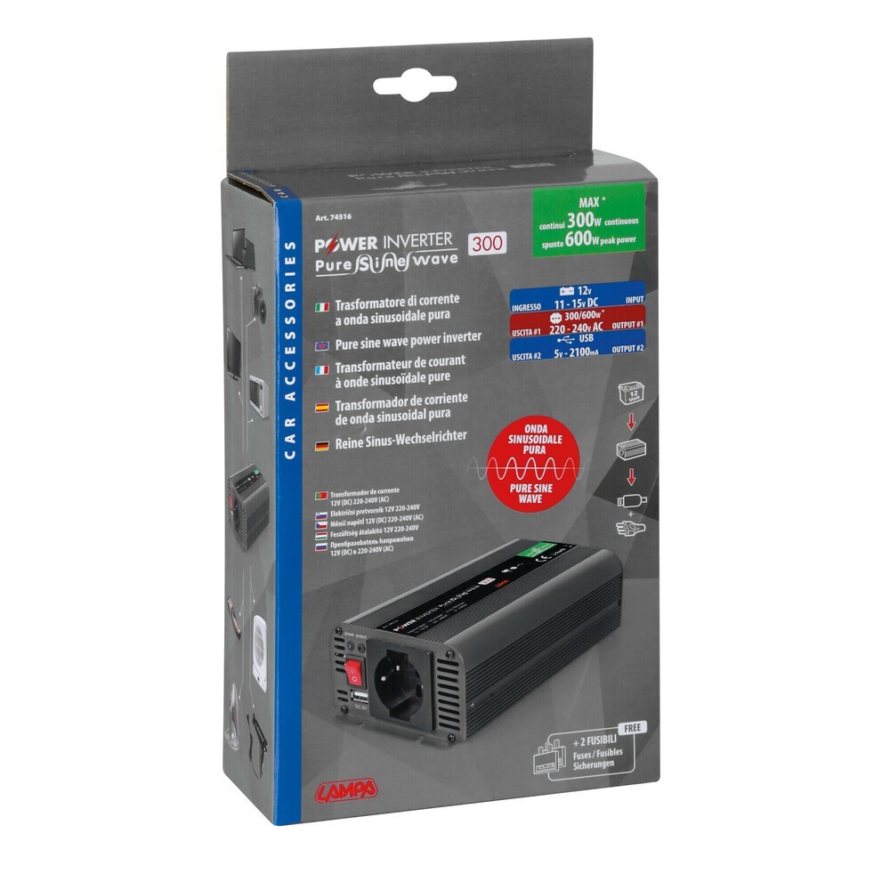 Power Inverter PSW300, trasformatore a onda sinusoidale pura 12V - 230V. L'inverter ad onda sinusoidale pura eroga in uscita una tensione di 230V con una forma d'onda uguale a quella della rete elettrica domestica garantendo una forma d'onda della corrente in uscita a 230V come quella della normale rete elettrica di casa, e' molto piu' sicura e pulita con immediati vantaggi: Compatibilita' con tutti gli apparecchi, anche quelli che hanno difficolta' a funzionare con inverter ad onda sinusoidale modificata. Minori consumi e maggiore efficienza energetica. Maggior potenza effettiva erogata. Maggior sicurezza contro corto-circuiti e surriscaldamento. Protezioni di sicurezza incorporate per proteggere il trasformatore, l'apparecchiatura ad esso collegata e la batteria del veicolo. Cavi batteria e spinotto accendisigari inclusi. Vano portafusibili esterno e coppia di fusibili aggiuntivi in dotazione. Trasformatore di corrente da 12V a 220-240V, permette di collegare apparecchiature alimentate a 220-240V a qualsiasi fonte di energia a 12V (Autovetture, furgoni, camper, imbarcazioni...). Fornisce corrente continua per apparecchiature fino a 300W di potenza con spunto fino a 600W. Protezioni di sicurezza incorporate per proteggere il trasformatore, l'apparecchiatura ad esso collegata e la batteria. Presa USB incorporata, Cavi batteria inclusi. Dimensione: 225x125x65mm