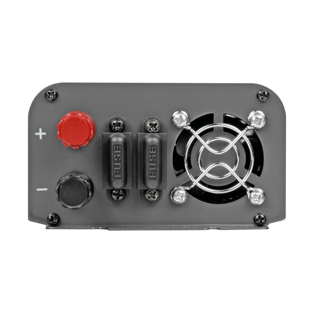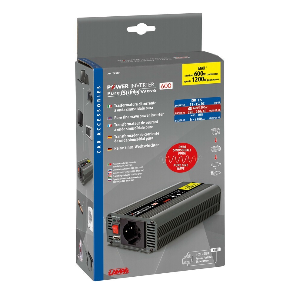 Power Inverter PSW600, trasformatore a onda sinusoidale pura 12V - 230V. L'inverter ad onda sinusoidale pura eroga in uscita una tensione di 230V con una forma d'onda uguale a quella della rete elettrica domestica garantendo una forma d'onda della corrente in uscita a 230V come quella della normale rete elettrica di casa, e' molto piu' sicura e pulita con immediati vantaggi: Compatibilita' con tutti gli apparecchi, anche quelli che hanno difficolta' a funzionare con inverter ad onda sinusoidale modificata. Minori consumi e maggiore efficienza energetica. Maggior potenza effettiva erogata. Maggior sicurezza contro corto-circuiti e surriscaldamento. Protezioni di sicurezza incorporate per proteggere il trasformatore, l'apparecchiatura ad esso collegata e la batteria del veicolo. Cavi batteria e spinotto accendisigari inclusi. Vano portafusibili esterno e coppia di fusibili aggiuntivi in dotazione. Trasformatore di corrente da 12V a 220-240V permette di collegare apparecchiature alimentate a 220-240V a qualsiasi fonte di energia a 12V (Autovetture, furgoni, camper, imbarcazioni...). Fornisce corrente continua per apparecchiature fino a 600W di potenza con spunto fino a 1200W. Presa USB incorporata, Cavi batteria inclusi. Dimensione: 310x125x65mm