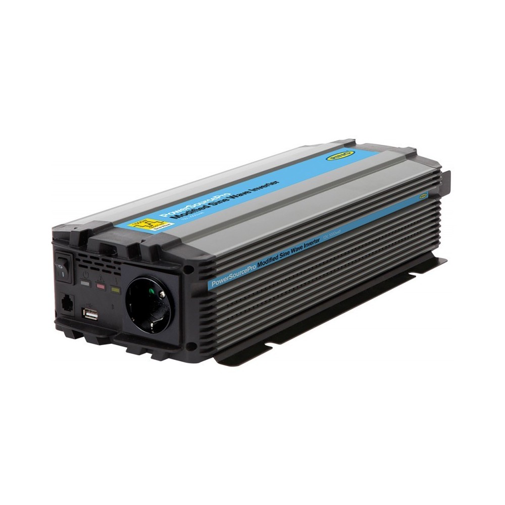 Inverter ad onda sinusoidale modificata 12V. Adatti ad alimentare la maggior parte delle attrezzature da lavoro, forni a microonde, frigoriferi, compressori etc.. Ideali per le applicazioni piu' impegnative. Con cavi di ingresso restitenti e morsetti per il collegamento diretto alle batterie. Scocca robusta in alluminio estruso adatto per l'uso professionale. Completamente protetto da sovraccarico, sovratemperatura e bassa / alta tensione. uscita USB da 2amp. Caratteristiche: Potenza continua: 1000W. Potenza di picco: 2000W. Tensione di uscita: 230V AC. Corrente di ingresso: 98amp (max). Assorbimento senza carico:<0.7amps. Dimensioni (LxPxA) / Peso: 340x170x81,5mm / 2,7Kg