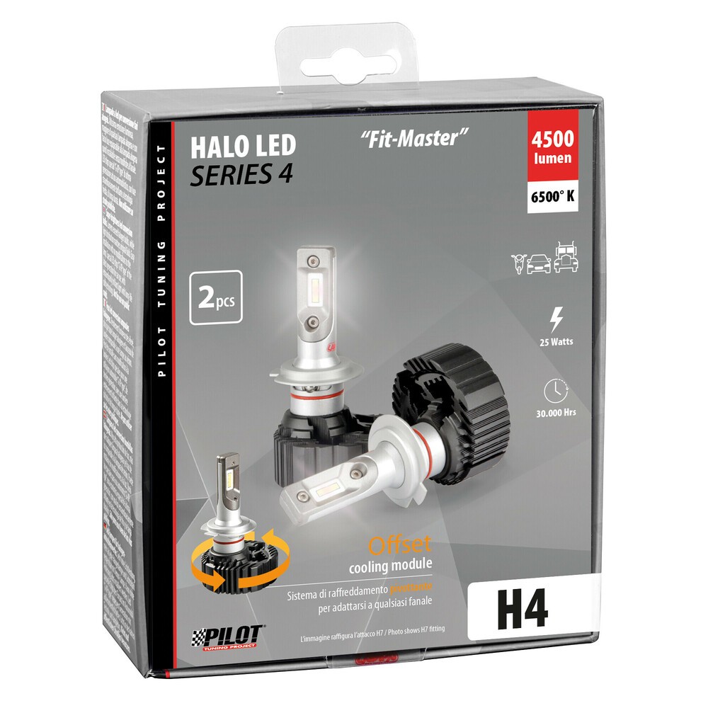 Kit di conversione fari alogeni in fari a led. Altissima emissione luminosa, maggiore di qualsiasi lampada alogena. Fascio di luce equiparabile alla lampada alogena. Installabili senza modifiche ai fanali. Luga durata (25.000 ore). Raffreddamento dinamico senza ventola. Scocca in alluminio con trattamento per una migliore dissipazione del calore, sistema intelligente di controllo temperatura. Caratteristiche: Led: 16 Lumiled ZES Chips, Tensione: 9-32V, Attacco: H4 (P43t), Potenza: 25W, Luminosita': 6500K, Lumen: 2250lm (cadauna).
