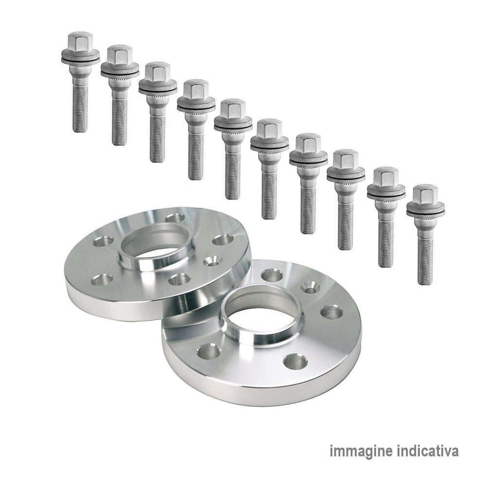 Coppia distanziali da 20mm cad. con bulloni a sede piatta e rondella integrata. Caratteristiche: PCD 5x108 - Mozzo 65.0mm - Filetto M12x1.25.