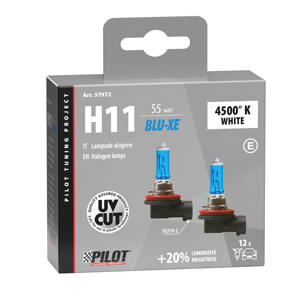 Pezzi per confezione: 2. Volt: 12V. Lampada: H11. Watt: 55W. Attacco: PGJ19-2. Luminosita': 4500K. Lampade speciali ad alte prestazionicon un fascio luce piu' potente del 20% rispetto alle lampadine alogene tradizionali. La luce ultra bianca emessa e' simile a quella delle lampade xeno con il caratteristico look azzurrato. Le lampade Blu-Xe sono particolarmente indicate per chi cerca la miglior sintesi tra look sportivo e prestazioni