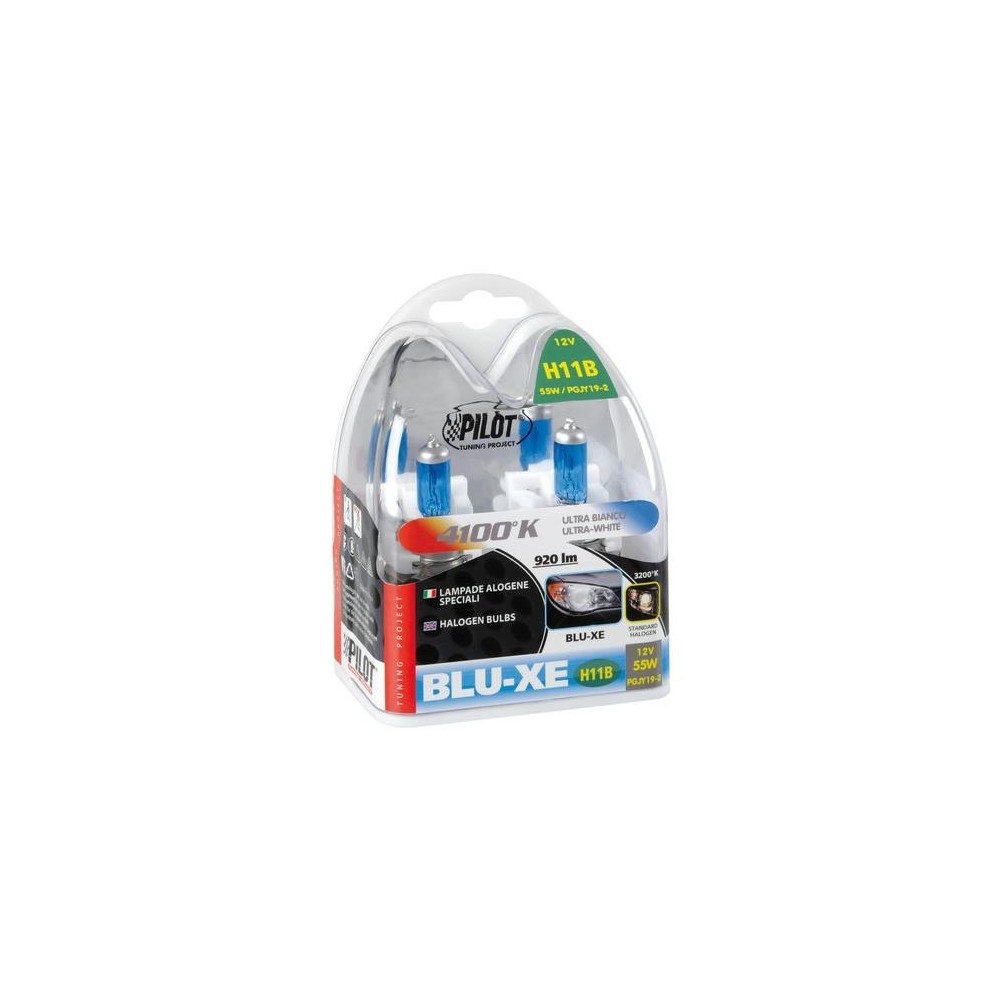 Lampade speciali ad alte prestazioni con un fascio luce piu' potente del 20% rispetto alle lampadine alogene tradizionali. La luce ultra bianca emessa e' simile a quella delle lampade xeno con il caratteristico look azzurrato. Le lampade Blu-Xe sono particolarmente indicate per chi cerca la miglior sintesi fra look sportivo e prestazioni. Attacco: H11B - PGJY19-2, Potenza: 55W, Lumen: 920 lm