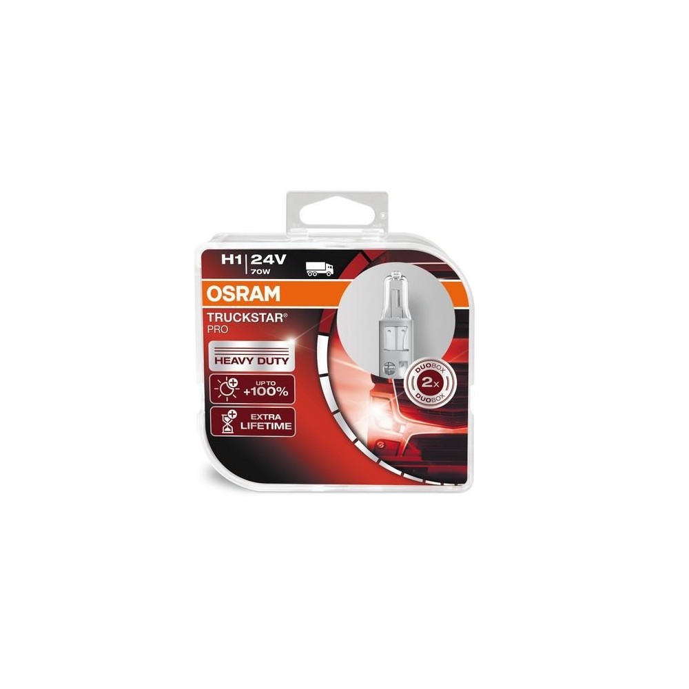 Quantita': 2 pezzi. Chi fa l'autista di professione guida spesso di notte e di conseguenza necessita di una visibilita' anteriore ottimale. Le lampade OSRAM TRUCKSTAR PRO surclassano le lampade tradizionali da 24V, permettendo agli autisti di concentrarsi al meglio. Offrono luminosita' doppia grazie alla robustezza e alla durata notevolmente lunga, riducono le sostituzioni, i tempi di fermo ed i costi del parco mezzi. Fino al 100% di luce in piu' sulla strada (rispetto alle lampade standard) grazie alla tecnologia brevettata a filamento singolo (Single Coil)