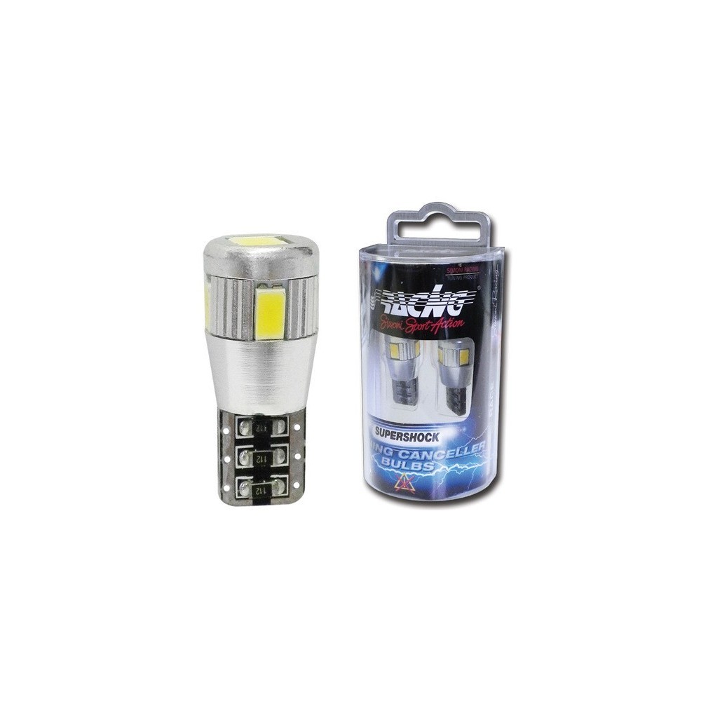 Kit 2 lampadine T10 a 6 chip led ad alta brillantezza con resistenza da 3 watt integrata. Led Ultrabianco. ATTENZIONE: Sebbene dotate di una resistenza interna compatibile con la grande maggioranza delle auto, su alcuni modelli potrebbero comunque accendersi spie sul cruscotto. In tal caso consigliamo di aggiungere un'ulteriore resistenza per spegnere la spia eludendo il computer di bordo.