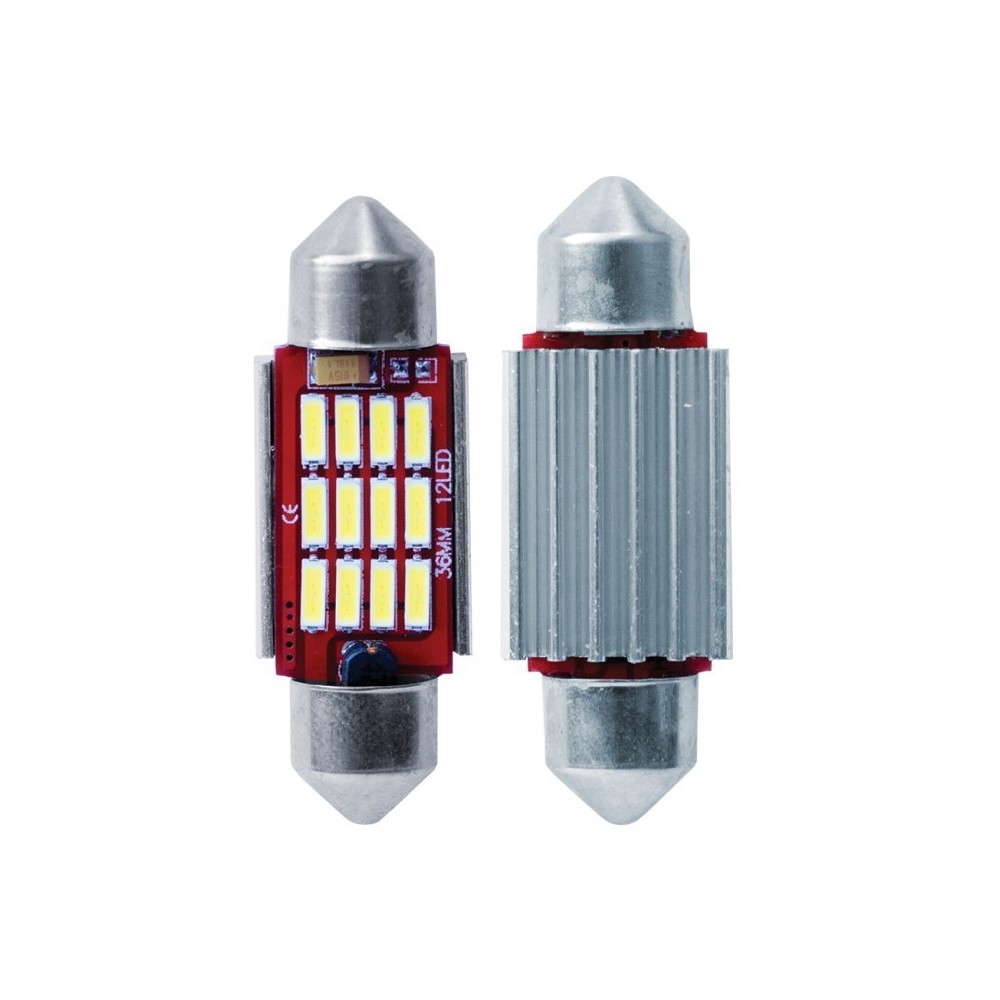 Kit 2 lampadine siluro a 12 microled alta brillantezza con resistenza da 3 watt integrata, dissipatore di calore e no polarity. Lunghezza 36mm. Led bianco. ATTENZIONE: Sebbene dotate di una resistenza interna (Canbus) risultando cosi' compatibile con la grande maggioranza delle auto, su alcuni modelli potrebbero comunque accendersi spie sul cruscotto. In tal caso consigliamo di aggiungere un'ulteriore resistenza per spegnere la spia eludendo il computer di bordo.